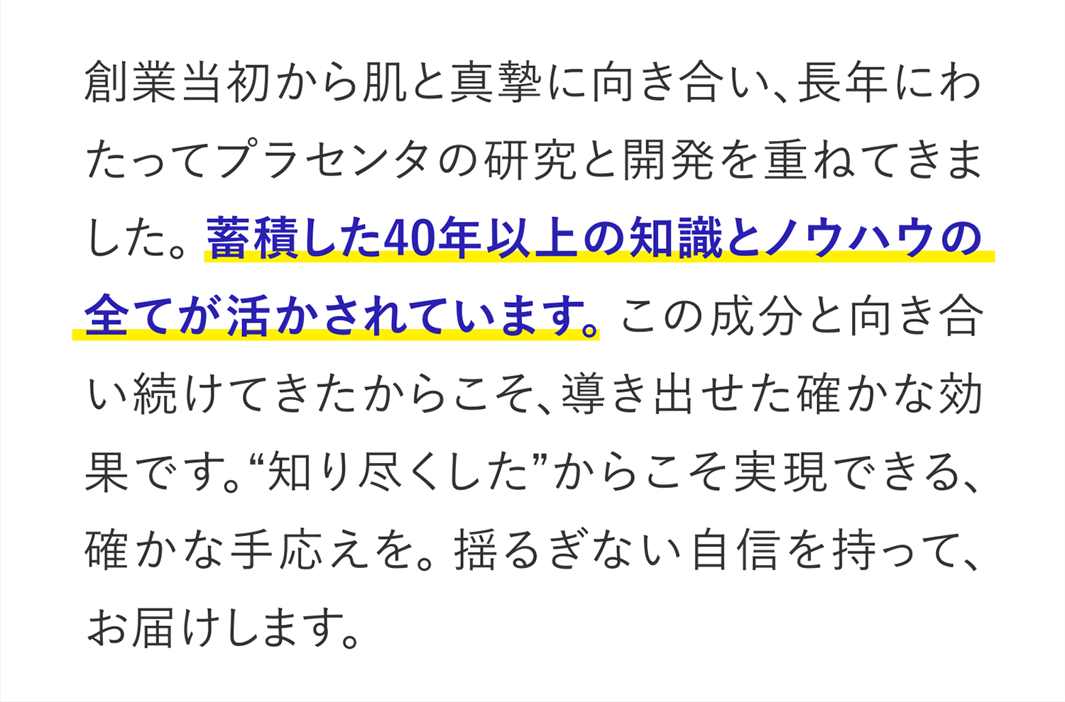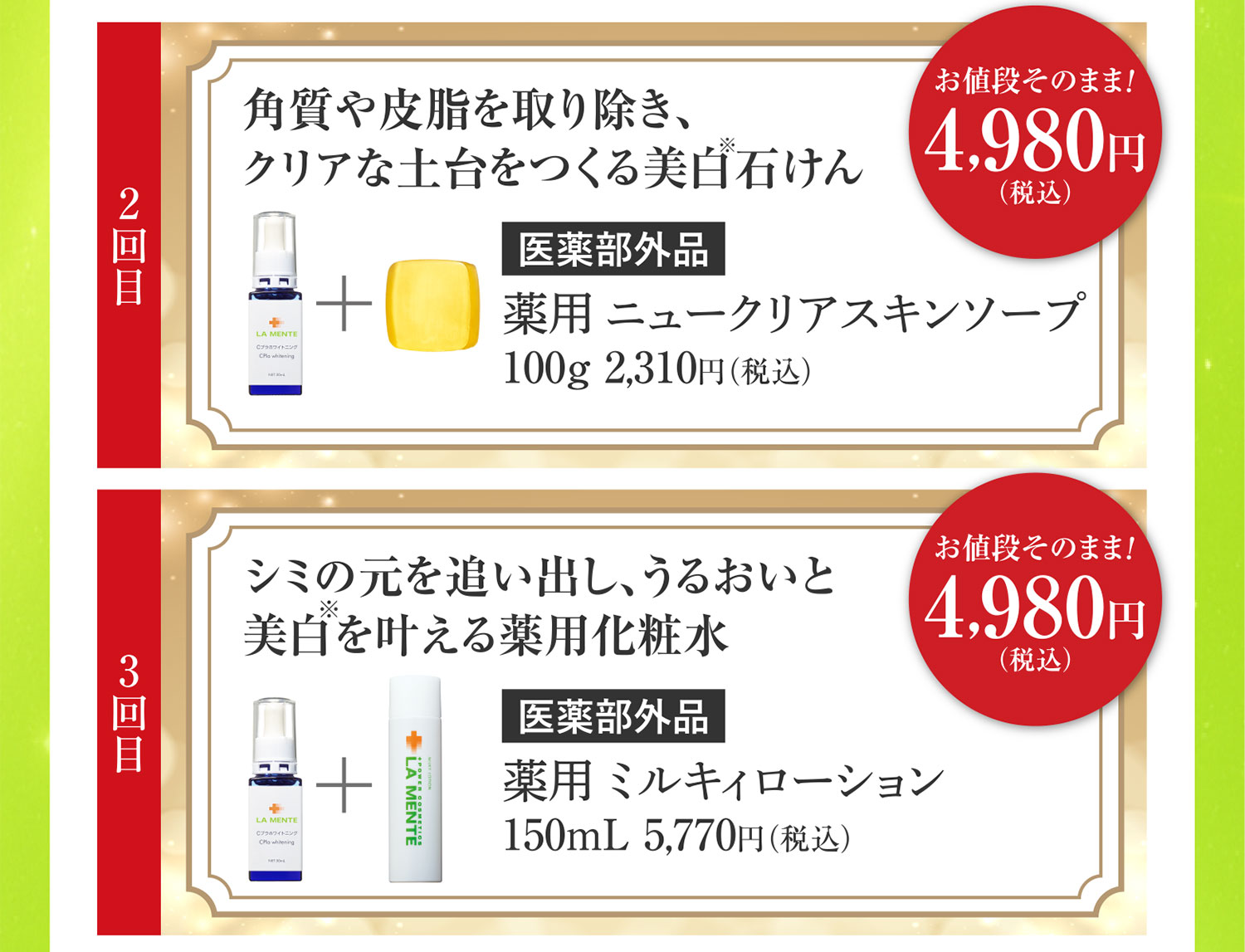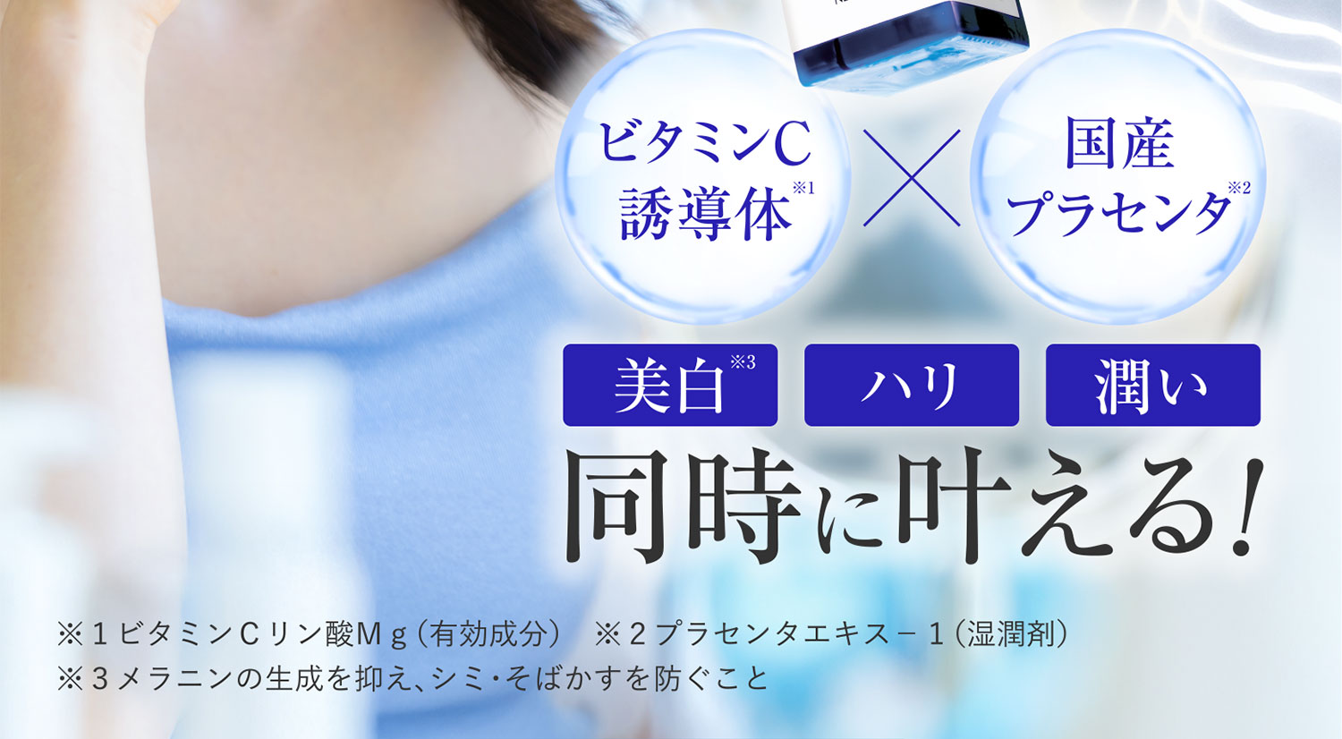 【有効成分】ビタミンCリン酸Mg 【その他の成分】プラセンタエキス-1、BG、クエン酸、水酸化Na、乳酸、フェノキシエタノール、エタノール、精製水